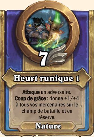 Heurt runique [...] Coup de grâce : donne +2/+6 à tous vos mercenaires sur le champs de bataille et en réserve [...] Coup de grâce : donne +3/+8 à tous vos mercenaires sur le champs de bataille et en réserve [...] Coup de grâce : donne +3/+9 à tous vos mercenaires sur le champs de bataille et en réserve [...] Coup de grâce : donne +3/+10 à tous vos mercenaires sur le champs de bataille et en réserve |