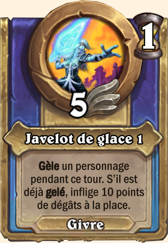 Javelot de glace Gèle un personnage pendant ce tour. S'il est déjà gelé, inflige 15 points de dégâts à la place Gèle un personnage pendant ce tour. S'il est déjà gelé, inflige 20 points de dégâts à la place Gèle un personnage pendant ce tour. S'il est déjà gelé, inflige 23 points de dégâts à la place Gèle un personnage pendant ce tour. S'il est déjà gelé, inflige 25 points de dégâts à la place |