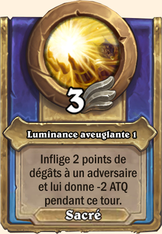 Luminance aveuglante Inflige 5 points de dégâts à un adversaire et lui donne -4 ATQ pendant ce tour Inflige 8 points de dégâts à un adversaire et lui donne -6 ATQ pendant ce tour Inflige 9 points de dégâts à un adversaire et lui donne -7 ATQ pendant ce tour Inflige 10 points de dégâts à un adversaire et lui donne -8 ATQ pendant ce tour |