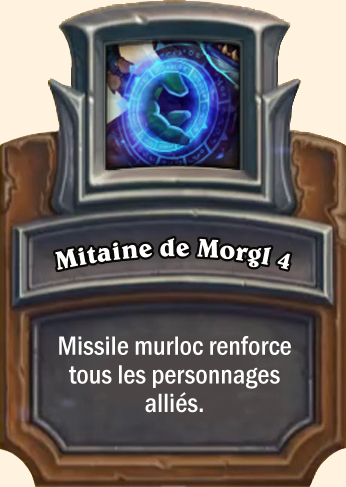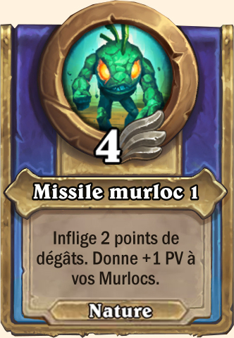 Missile murloc Inflige 5 points de dégâts. Donne +3 PV à vos Murlocs Inflige 8 points de dégâts. Donne +5 PV à vos Murlocs Inflige 9 points de dégâts. Donne +5 PV à vos Murlocs Inflige 10 points de dégâts. Donne +5 PV à vos Murlocs |