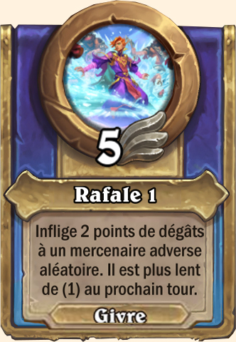 Rafale Inflige 3 points de dégâts à 2 mercenaires adverses aléatoires. Ils sont plus lents de (2) au prochain tour Inflige 4 points de dégâts à 3 mercenaires adverses aléatoires. Ils sont plus lents de (2) au prochain tour Inflige 5 points de dégâts à 3 mercenaires adverses aléatoires. Ils sont plus lents de (2) au prochain tour Inflige 6 points de dégâts à 3 mercenaires adverses aléatoires. Ils sont plus lents de (2) au prochain tour |