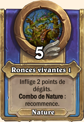 Ronces vivantes Inflige 5 points de dégâts. Combo de Nature : recommence Inflige 8 points de dégâts. Combo de Nature : recommence Inflige 9 points de dégâts. Combo de Nature : recommence Inflige 10 points de dégâts. Combo de Nature : recommence |