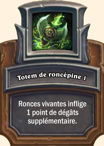 Totem de roncépine Ronces vivantes inflige 2 points de dégâts supplémentaires Ronces vivantes inflige 3 points de dégâts supplémentaires Ronces vivantes inflige 4 points de dégâts supplémentaires |