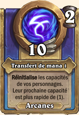 Transfert de mana Réinitialise les capacités de vos personnages. Leur prochaine capacité est plus rapide de (2) Réinitialise les capacités de vos personnages. Leur prochaine capacité est plus rapide de (3) Réinitialise les capacités de vos personnages. Leur prochaine capacité est plus rapide de (4) Réinitialise les capacités de vos personnages. Leur prochaine capacité est plus rapide de (5) |