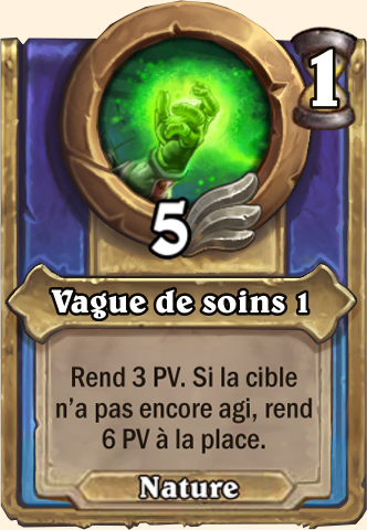 Vague de soins Rend 8 PV. Si la cible n'a pas encore agi, rend 16 PV à la place Rend 11 PV. Si la cible n'a pas encore agi, rend 26 PV à la place Rend 22 PV. Si la cible n'a pas encore agi, rend 26 PV à la place Rend 15 PV. Si la cible n'a pas encore agi, rend 30 PV à la place |