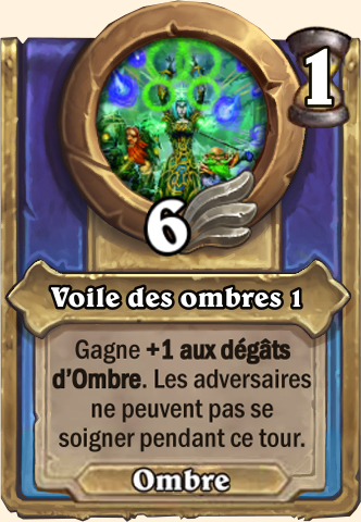 Voile des ombres Gagne +2 aux dégâts d'Ombre. Les adversaires ne peuvent pas se soigner pendant ce tour Gagne +3 aux dégâts d'Ombre. Les adversaires ne peuvent pas se soigner pendant ce tour Gagne +4 aux dégâts d'Ombre. Les adversaires ne peuvent pas se soigner pendant ce tour Gagne +5 aux dégâts d'Ombre. Les adversaires ne peuvent pas se soigner pendant ce tour |