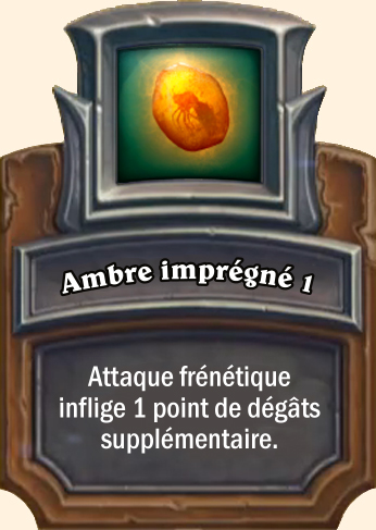 Ambre imprégné Attaque frénétique inflige 2 points de dégâts supplémentaires Attaque frénétique inflige 3 points de dégâts supplémentaires Attaque frénétique inflige 4 points de dégâts supplémentaires |