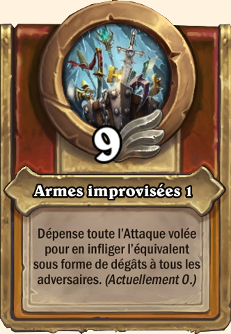 Armes improvisées Dépense toute l’Attaque volée pour en infliger l’équivalent sous forme de dégâts à tous les adversaires Dépense toute l’Attaque volée pour en infliger l’équivalent sous forme de dégâts à tous les adversaires Dépense toute l’Attaque volée pour en infliger l’équivalent sous forme de dégâts à tous les adversaires Dépense toute l’Attaque volée pour en infliger l’équivalent sous forme de dégâts à tous les adversaires |