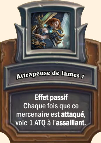 Attrapeuse de lames Effet passif. Chaque fois que ce mercenaire est attaqué, vole 2 ATQ à l’assaillant Effet passif. Chaque fois que ce mercenaire est attaqué, vole 3 ATQ à l’assaillant Effet passif. Chaque fois que ce mercenaire est attaqué, vole 4 ATQ à l’assaillant |