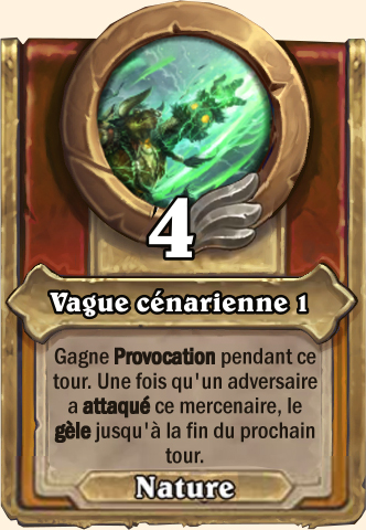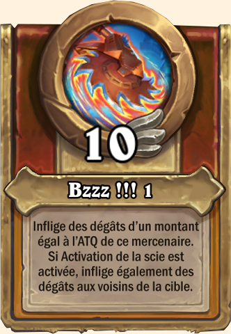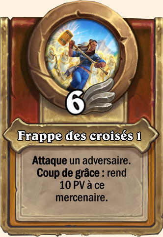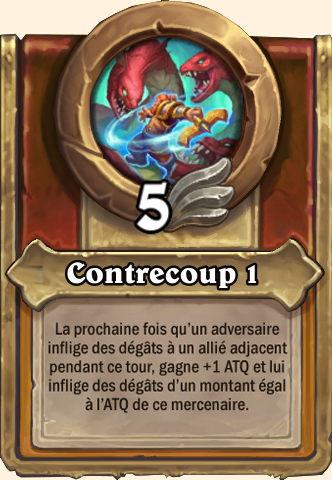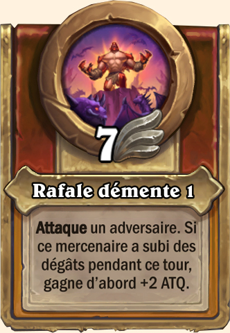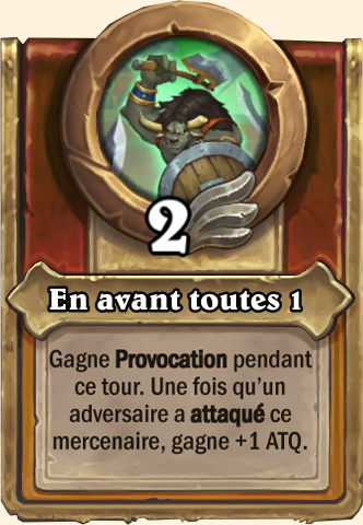 En avant toutes Gagne Provocation pendant ce tour. Une fois qu’un adversaire a attaqué ce mercenaire, gagne +2 ATQ Gagne Provocation pendant ce tour. Une fois qu’un adversaire a attaqué ce mercenaire, gagne +3 ATQ Gagne Provocation pendant ce tour. Une fois qu’un adversaire a attaqué ce mercenaire, gagne +4 ATQ Gagne Provocation pendant ce tour. Une fois qu’un adversaire a attaqué ce mercenaire, gagne +5 ATQ |