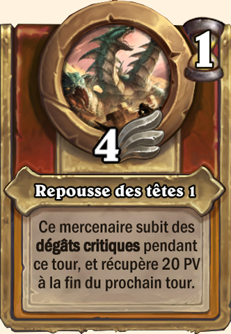 Repousse des têtes Ce mercenaire subit des dégâts critiques pendant ce tour, et récupère 30 PV à la fin du prochain tour Ce mercenaire subit des dégâts critiques pendant ce tour, et récupère 40 PV à la fin du prochain tour Ce mercenaire subit des dégâts critiques pendant ce tour, et récupère 50 PV à la fin du prochain tour Ce mercenaire subit des dégâts critiques pendant ce tour, et récupère tous ses PV à la fin du prochain tour |