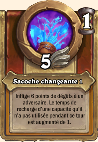 Sacoche changeante Inflige 8 points de dégâts à un adversaire. [...] qu’il n’a pas utilisée pendant ce tour est augmenté de 1 Inflige 12 points de dégâts à un adversaire. [...] qu’il n’a pas utilisée pendant ce tour est augmenté de 1 Inflige 14 points de dégâts à un adversaire. [...] qu’il n’a pas utilisée pendant ce tour est augmenté de 1 Inflige 16 points de dégâts à un adversaire. [...] qu’il n’a pas utilisée pendant ce tour est augmenté de 1 |