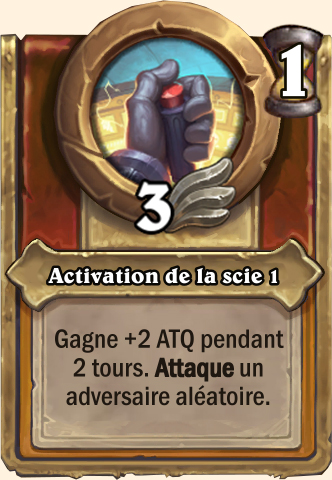 Activation de la scie Gagne +3 ATQ pendant 2 tours. Attaque un adversaire aléatoire Gagne +4 ATQ pendant 2 tours. Attaque un adversaire aléatoire Gagne +5 ATQ pendant 2 tours. Attaque un adversaire aléatoire Gagne +6 ATQ pendant 2 tours. Attaque un adversaire aléatoire |
