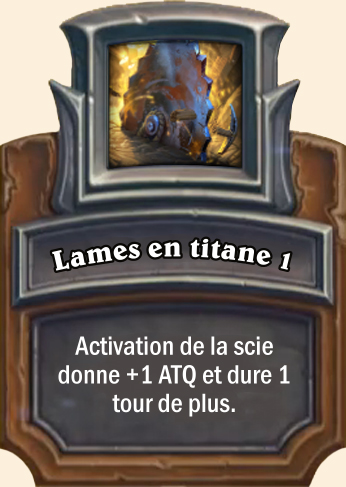 Lames en titane Activation de la scie donne +2 ATQ et dure 1 tour de plus Activation de la scie donne +3 ATQ et dure 1 tour de plus Activation de la scie donne +4 ATQ et dure 1 tour de plus |