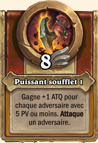 Puissant soufflet Gagne +2 ATQ pour chaque adversaire avec 10 PV ou moins. Attaque un adversaire Gagne +3 ATQ pour chaque adversaire avec 20 PV ou moins. Attaque un adversaire Gagne +4 ATQ pour chaque adversaire avec 30 PV ou moins. Attaque un adversaire Gagne +8 ATQ pour chaque adversaire avec 40 PV ou moins. Attaque un adversaire |