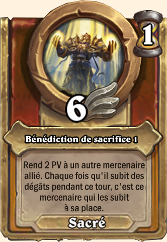 Bénédiction de sacrifice Rend 4 PV à un autre mercenaire allié. Chaque fois qu'il subit des dégâts pendant ce tour, [...] Rend 6 PV à un autre mercenaire allié. Chaque fois qu'il subit des dégâts pendant ce tour, [...] Rend 8 PV à un autre mercenaire allié. Chaque fois qu'il subit des dégâts pendant ce tour, [...] Rend 10 PV à un autre mercenaire allié. Chaque fois qu'il subit des dégâts pendant ce tour, [...] |