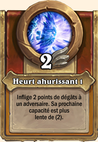 Heurt ahurissant Inflige 5 points de dégâts à un adversaire. Sa prochaine capacité est plus lente de (3) Inflige 8 points de dégâts à un adversaire. Sa prochaine capacité est plus lente de (4) Inflige 9 points de dégâts à un adversaire. Sa prochaine capacité est plus lente de (5) Inflige 10 points de dégâts à un adversaire. Sa prochaine capacité est plus lente de (6) |