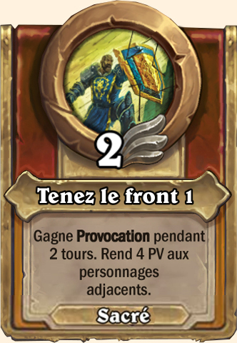 Tenez le front Gagne Provocation pendant 2 tours. Rend 8 PV aux personnages adjacents Gagne Provocation pendant 2 tours. Rend 12 PV aux personnages adjacents Gagne Provocation pendant 2 tours. Rend 13 PV aux personnages adjacents Gagne Provocation pendant 2 tours. Rend 14 PV aux personnages adjacents |
