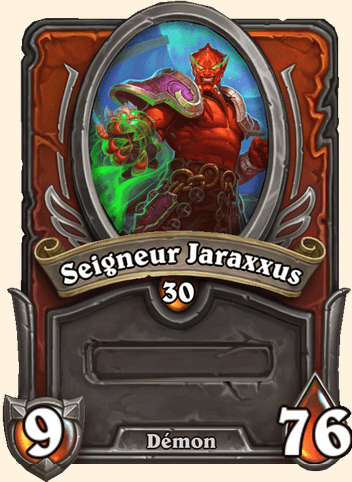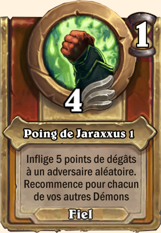 Poing de Jaraxxus Inflige 9 points de dégâts à un adversaire aléatoire. Recommence pour chacun de vos autres Démons Inflige 13 points de dégâts à un adversaire aléatoire. Recommence pour chacun de vos autres Démons Inflige 14 points de dégâts à un adversaire aléatoire. Recommence pour chacun de vos autres Démons Inflige 15 points de dégâts à un adversaire aléatoire. Recommence pour chacun de vos autres Démons |