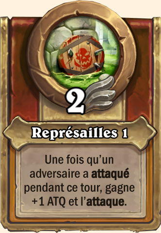 Représailles Une fois qu’un adversaire a attaqué pendant ce tour, gagne +2 ATQ et l’attaque. Une fois qu’un adversaire a attaqué pendant ce tour, gagne +3 ATQ et l’attaque. Une fois qu’un adversaire a attaqué pendant ce tour, gagne +4 ATQ et l’attaque. Une fois qu’un adversaire a attaqué pendant ce tour, gagne +5 ATQ et l’attaque. |