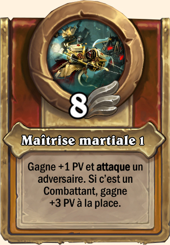 Maîtrise martiale Gagne +2 PV et attaque un adversaire. Si c'est un Combattant, gagne +5 PV à la place Gagne +3 PV et attaque un adversaire. Si c'est un Combattant, gagne +8 PV à la place Gagne +4 PV et attaque un adversaire. Si c'est un Combattant, gagne +9 PV à la place Gagne +5 PV et attaque un adversaire. Si c'est un Combattant, gagne +10 PV à la place |