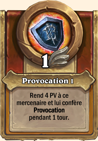 Provocation Rend 7 PV à ce mercenaire et lui confère Provocation pendant 1 tour Rend 10 PV à ce mercenaire et lui confère Provocation pendant 2 tours Rend 11 PV à ce mercenaire et lui confère Provocation pendant 3 tours Rend 12 PV à ce mercenaire et lui confère Provocation pendant 3 tours |