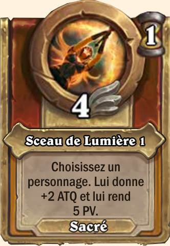 Sceau de Lumière Choisissez un personnage. Lui donne +3 ATQ et lui rend 8 PV Choisissez un personnage. Lui donne +4 ATQ et lui rend 11 PV Choisissez un personnage. Lui donne +5 ATQ et lui rend 13 PV Choisissez un personnage. Lui donne +6 ATQ et lui rend 15 PV |