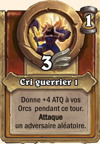 Cri guerrier Donne +6 ATQ à vos Orcs pendant ce tour. Attaque un ennemi aléatoire Donne +8 ATQ à vos Orcs pendant ce tour. Attaque un ennemi aléatoire Donne +9 ATQ à vos Orcs pendant ce tour. Attaque un ennemi aléatoire Donne +10 ATQ à vos Orcs pendant ce tour. Attaque un ennemi aléatoire |