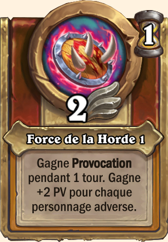 Force de la Horde Gagne Provocation pendant 1 tour. Gagne +5 PV pour chaque personnage adverse Gagne Provocation pendant 2 tours. Gagne +8 PV pour chaque personnage adverse Gagne Provocation pendant 2 tours. Gagne +9 PV pour chaque personnage adverse Gagne Provocation pendant 2 tours. Gagne +10 PV pour chaque personnage adverse |