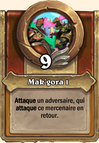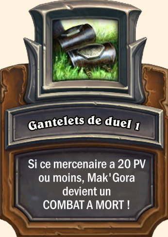 Gantelets de duel Si ce mercenaire à 30 PV ou moins, Mak'Gora devient un COMBAT A MORT ! Si ce mercenaire à 40 PV ou moins, Mak'Gora devient un COMBAT A MORT ! Si ce mercenaire à 50 PV ou moins, Mak'Gora devient un COMBAT A MORT ! |