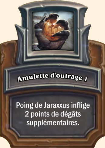 Amulette d'outrage Poing de Jaraxxus inflige 3 points de dégâts supplémentaires Poing de Jaraxxus inflige 4 points de dégâts supplémentaires Poing de Jaraxxus inflige 5 points de dégâts supplémentaires |