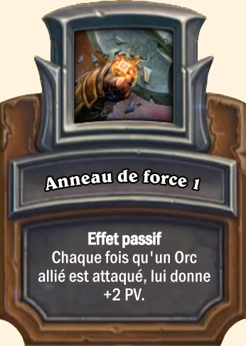 Anneau de force Effet passif. Chaque fois qu'un Orc allié est attaqué, lui donne +4 PV Effet passif. Chaque fois qu'un Orc allié est attaqué, lui donne +6 PV Effet passif. Chaque fois qu'un Orc allié est attaqué, lui donne +8 PV |