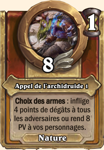 Appel de l'archidruide Choix des armes : inflige 7 points de dégâts à tous les adversaires ou rend 14 PV à vos personnages Choix des armes : inflige 10 points de dégâts à tous les adversaires ou rend 20 PV à vos personnages Choix des armes : inflige 11 points de dégâts à tous les adversaires ou rend 22 PV à vos personnages Choix des armes : inflige 12 points de dégâts à tous les adversaires ou rend 24 PV à vos personnages |