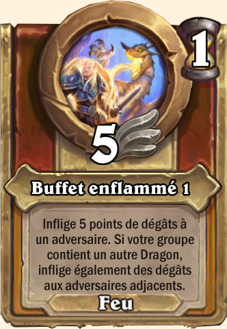 Buffet enflammé Inflige 10 points de dégâts à un adversaire. [...] Inflige 14 points de dégâts à un adversaire. [...] Inflige 15 points de dégâts à un adversaire. [...] Inflige 16 points de dégâts à un adversaire. [...] |