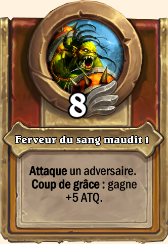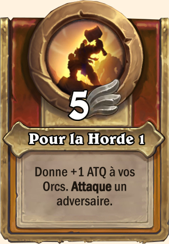 Pour la Horde Donne +2 ATQ à vos Orcs. Attaque un adversaire Donne +3 ATQ à vos Orcs. Attaque un adversaire Donne +4 ATQ à vos Orcs. Attaque un adversaire Donne +5 ATQ à vos Orcs. Attaque un adversaire |