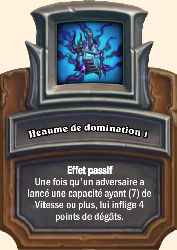 Heaume de domination Effet passif. Une fois qu'un adversaire a lancé une capacité ayant (7) de Vitesse ou plus, [...] Effet passif. Une fois qu'un adversaire a lancé une capacité ayant (7) de Vitesse ou plus, [...] Effet passif. Une fois qu'un adversaire a lancé une capacité ayant (7) de Vitesse ou plus, [...] |