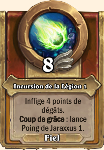 Incursion de la Légion Inflige 8 points de dégâts. Coup de grâce : lance Poing de Jaraxxus 2 Inflige 12 points de dégâts. Coup de grâce : lance Poing de Jaraxxus 3 Inflige 13 points de dégâts. Coup de grâce : lance Poing de Jaraxxus 4 Inflige 14 points de dégâts. Coup de grâce : lance Poing de Jaraxxus 5 |