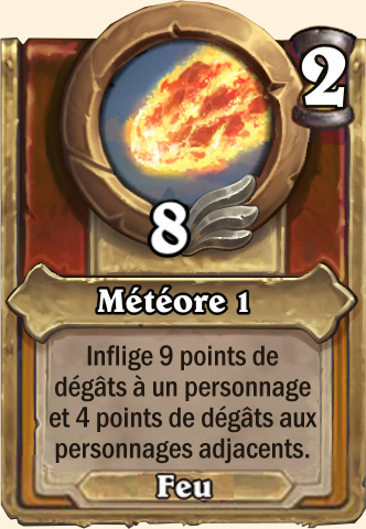 Météore Inflige 15 points de dégâts à un personnage et 6 points de dégâts aux personnages adjacents Inflige 21 points de dégâts à un personnage et 8 points de dégâts aux personnages adjacents Inflige 23 points de dégâts à un personnage et 9 points de dégâts aux personnages adjacents Inflige 25 points de dégâts à un personnage et 10 points de dégâts aux personnages adjacents |