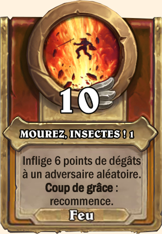 MOUREZ, INSECTES ! Inflige 12 points de dégâts à un adversaire aléatoire. Coup de grâce : recommence Inflige 18 points de dégâts à un adversaire aléatoire. Coup de grâce : recommence Inflige 20 points de dégâts à un adversaire aléatoire. Coup de grâce : recommence Inflige 22 points de dégâts à un adversaire aléatoire. Coup de grâce : recommence |