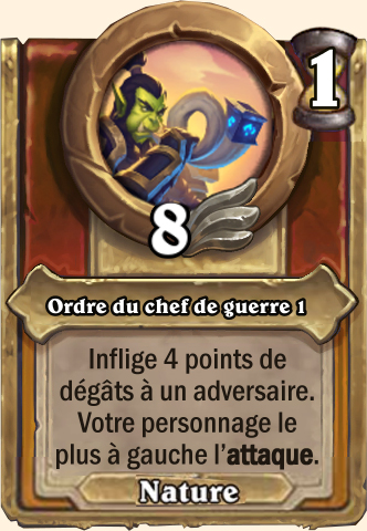 Ordre du chef de guerre Inflige 7 points de dégâts à un adversaire. Votre personnage le plus à gauche l’attaque Inflige 10 points de dégâts à un adversaire. Votre personnage le plus à gauche l’attaque Inflige 11 points de dégâts à un adversaire. Votre personnage le plus à gauche l’attaque Inflige 12 points de dégâts à un adversaire. Votre personnage le plus à gauche l’attaque |
