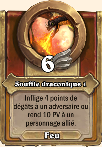 Souffle draconique Inflige 8 points de dégâts à un adversaire ou rend 14 PV à un personnage allié Inflige 12 points de dégâts à un adversaire ou rend 18 PV à un personnage allié Inflige 13 points de dégâts à un adversaire ou rend 19 PV à un personnage allié Inflige 14 points de dégâts à un adversaire ou rend 20 PV à un personnage allié |