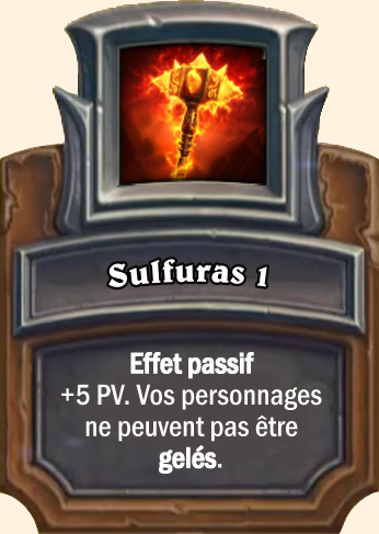 Sulfuras Effet passif. +10 PV. Vos personnages ne peuvent pas être gelés Effet passif. +15 PV. Vos personnages ne peuvent pas être gelés Effet passif. +20 PV. Vos personnages ne peuvent pas être gelés |