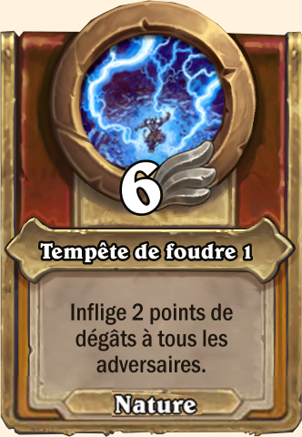 Tempête de foudre Inflige 5 points de dégâts à tous les adversaires Inflige 8 points de dégâts à tous les adversaires Inflige 9 points de dégâts à tous les adversaires Inflige 10 points de dégâts à tous les adversaires |