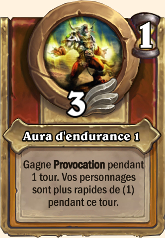 Aura d'endurance Gagne Provocation pendant 1 tour. Vos personnages sont plus rapides de (2) pendant ce tour Gagne Provocation pendant 2 tours. Vos personnages sont plus rapides de (2) pendant ce tour Gagne Provocation pendant 2 tours. Vos personnages sont plus rapides de (3) pendant ce tour Gagne Provocation pendant 2 tours. Vos personnages sont plus rapides de (4) pendant ce tour |