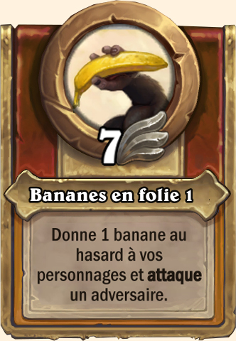 Bananes en folie Donne 2 bananes au hasard à vos personnages et attaque un adversaire Donne 3 bananes au hasard à vos personnages et attaque un adversaire Donne 4 bananes au hasard à vos personnages et attaque un adversaire Donne 5 bananes au hasard à vos personnages et attaque un adversaire |