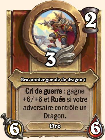 Braconnier gueule-de-dragon Cri de guerre : gagne +9/+9 et Ruée si votre adversaire contrôle un Dragon Cri de guerre : gagne +12/+12 et Ruée si votre adversaire contrôle un Dragon Cri de guerre : gagne +14/+14 et Ruée si votre adversaire contrôle un Dragon Cri de guerre : gagne +15/+15 et Ruée si votre adversaire contrôle un Dragon |