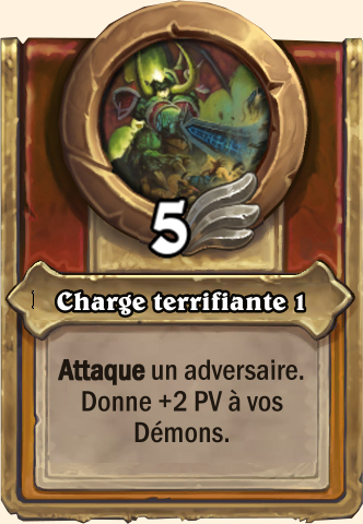 Charge terrifiante Attaque un adversaire. Donne +4 PV à vos Démons Attaque un adversaire. Donne +6 PV à vos Démons Attaque un adversaire. Donne +7 PV à vos Démons Attaque un adversaire. Donne +8 PV à vos Démons |