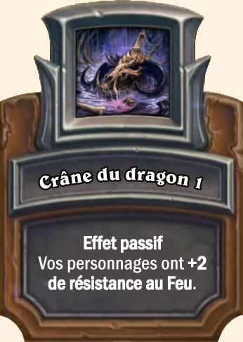 Crâne du dragon Effet passif. Vos personnages ont +3 de résistance au Feu Effet passif. Vos personnages ont +4 de résistance au Feu Effet passif. Vos personnages ont +5 de résistance au Feu |