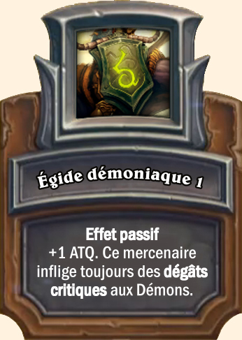 Égide démoniaque Effet passif. +2 ATQ. Ce mercenaire inflige toujours des dégâts critiques aux Démons Effet passif : +3 ATQ. Ce mercenaire inflige toujours des dégâts critiques aux Démons Effet passif : +4 ATQ. Ce mercenaire inflige toujours des dégâts critiques aux Démons |