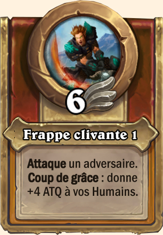 Frappe clivante Attaque un adversaire. Coup de grâce : donne +7 ATQ à vos Humains Attaque un adversaire. Coup de grâce : donne +10 ATQ à vos Humains Attaque un adversaire. Coup de grâce : donne +11 ATQ à vos Humains Attaque un adversaire. Coup de grâce : donne +12 ATQ à vos Humains |